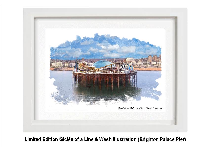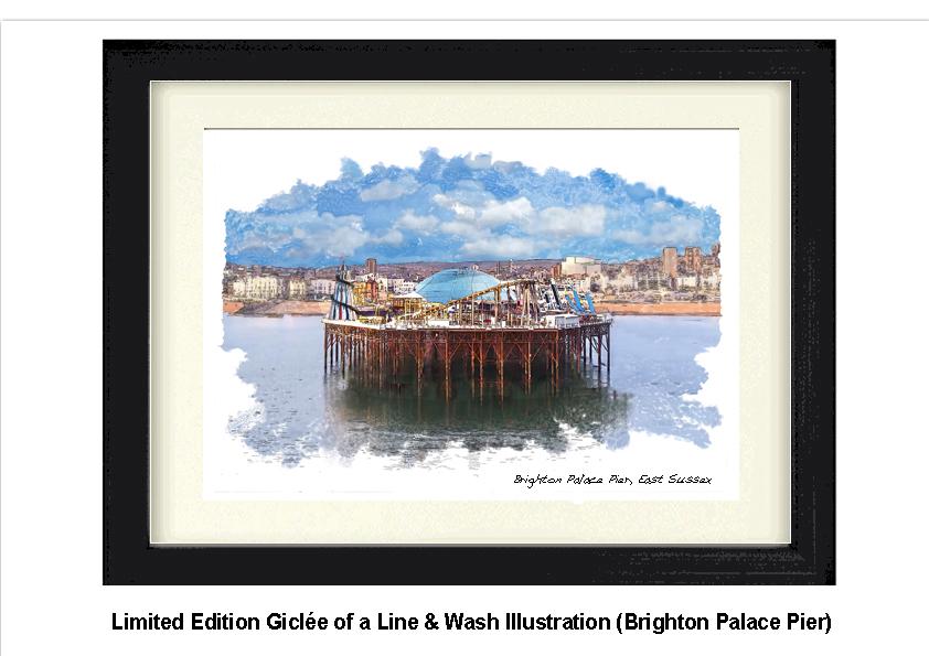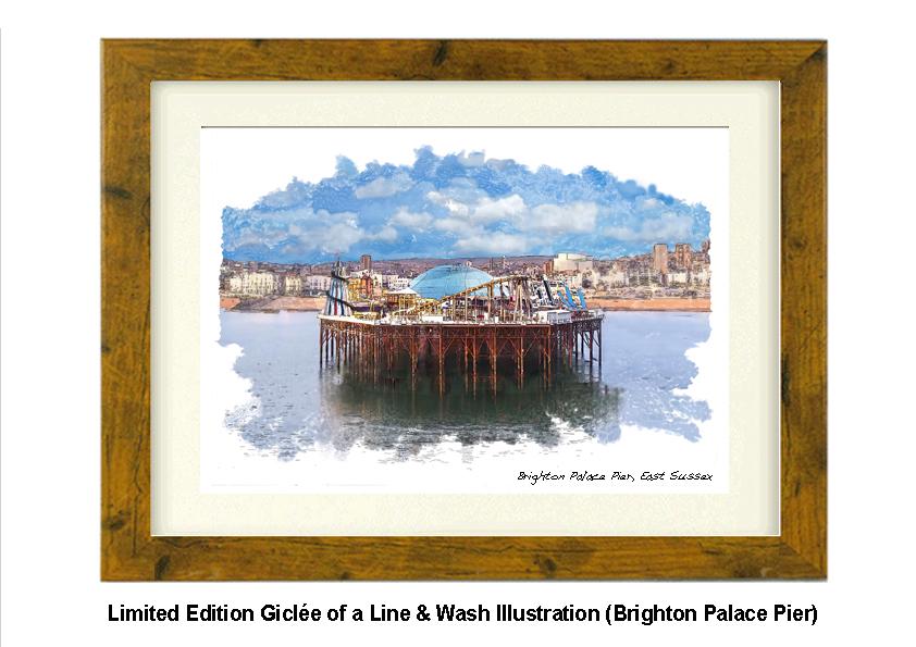 With a choice of three coloured frames, Black, White and Rustic, this Limited Edition Giclée Print is from an original line and wash Illustration Brighton Palace Pier by Gerald Bright.