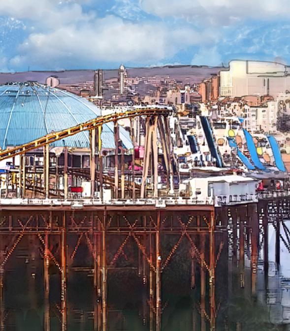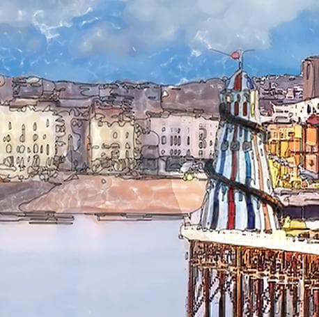 Brighton Palace Pier was created using ink and dyes on Daler-Rowney art paper, a line-and-wash style that is depicted in this fine-quality print.